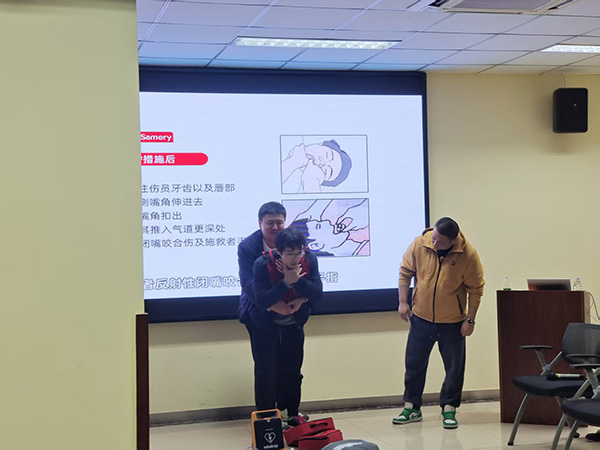 培训中,韩老师结合大量生活中的实例,系统讲解了气道异物梗阻的急救要领、心搏骤停的识别、心肺复苏的操作流程、以及自动体外除颤器(AED)的使用方法。他将深入浅出的理论讲解与规范娴熟的实操演示紧密结合,使复杂的急救知识变得清晰易懂。在随后的实操练习环节,员工们反复练习胸外按压、人工呼吸及AED使用的每一个步骤。大家认真学习,全情投入,积极操练。参加培训的员工纷纷表示受益匪浅。